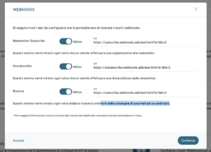 Cliccando sul bottone “Apri” si visualizza una pop-up all’interno del quale è possibile scegliere la tipologia di Webhook da attivare, visualizzando per ciascuno la URL relativa.
