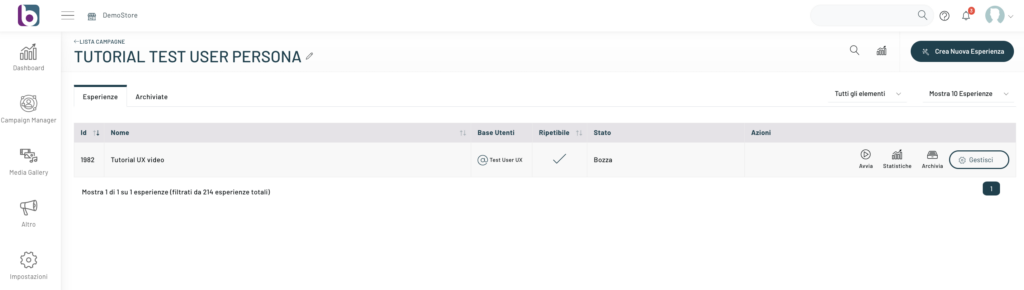 Una volta configurata una nuova campagna, cliccare in alto a sinistra il bottone blu “Crea una nuova esperienza”.