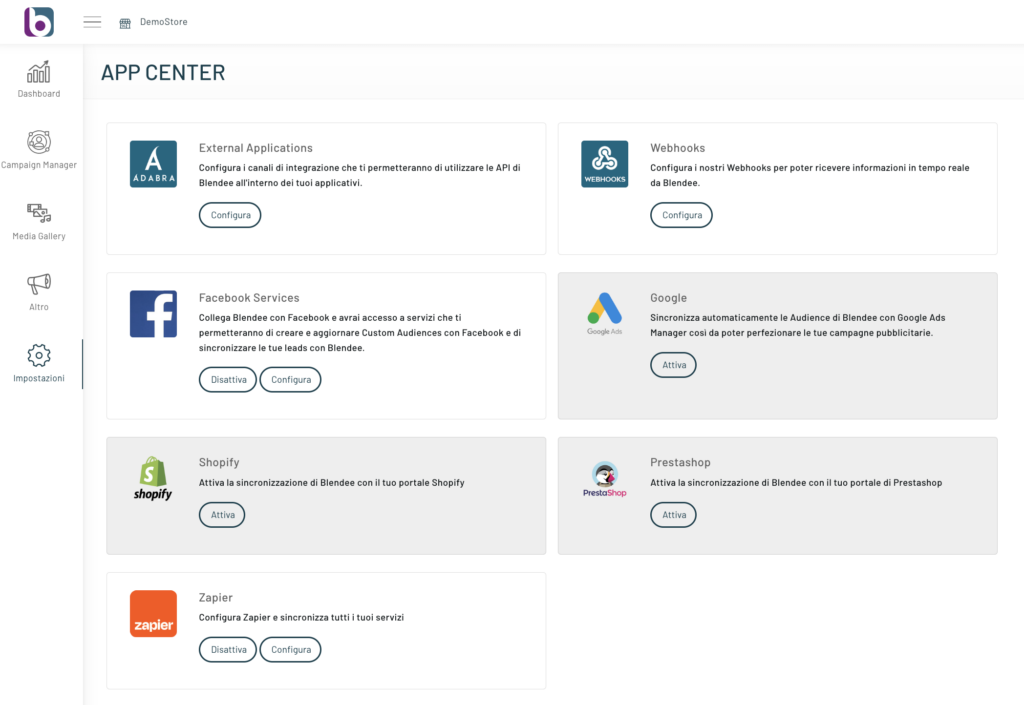 Per procedere con l’attivazione del modulo di Facebook, cliccare App Center sul menù laterale.