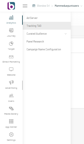 Blendee genera una Audience Direct direttamente durante la fase di creazione dei tag, pagina accessibile cliccando prima sulla voce “Advertising” e poi “Tracking TAG” nel menu principale di Blendee.