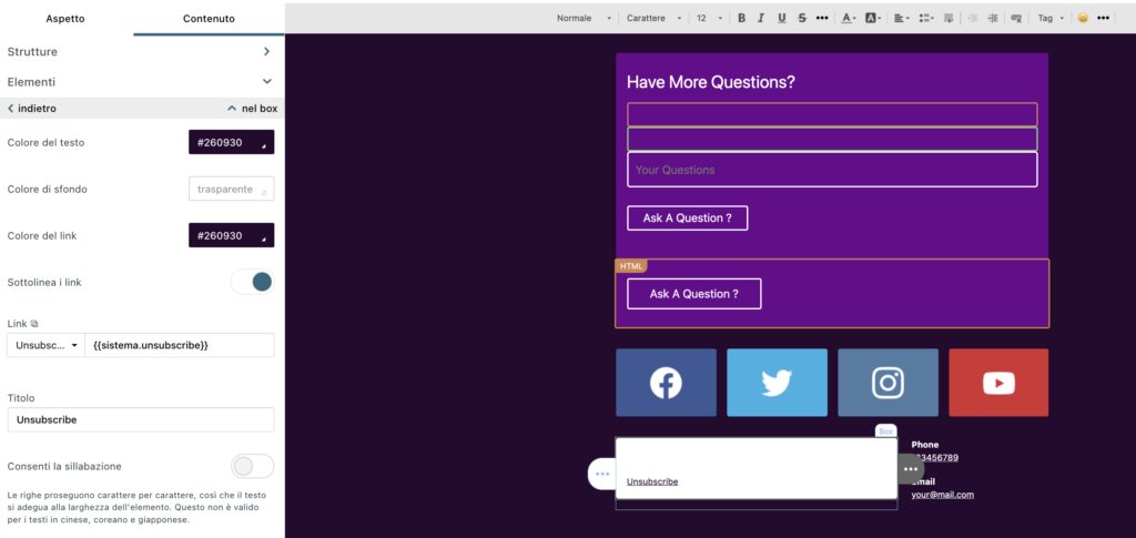 As we have seen in the article “How to Insert Contextual Values in Emails Thanks to the Built-in Editor”, thanks to the editor it is possible to insert the unsubscribe (with the introduction of the new Privacy Code “GDPR” this value is mandatory).