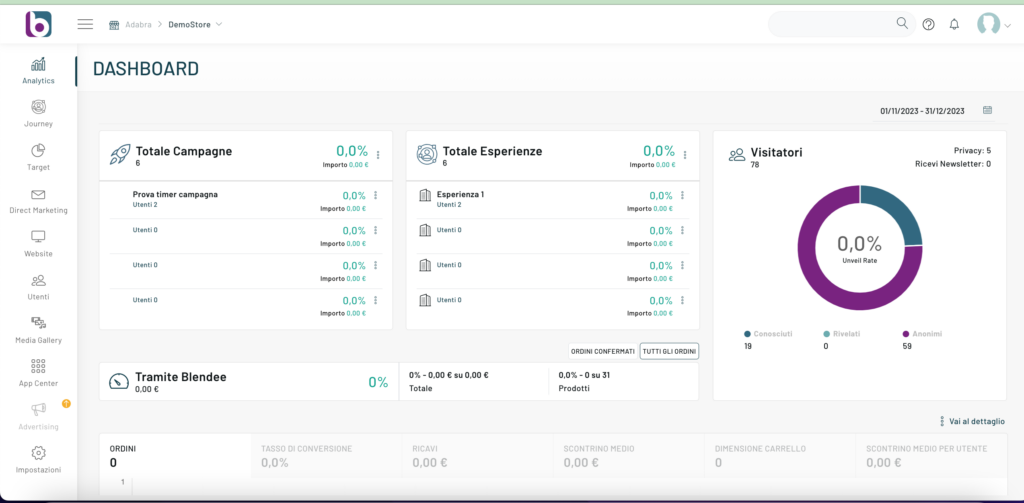 In the central part, when you first log in, you will see the Dashboard with all the information you need to define accurate strategies and evaluate their effectiveness.