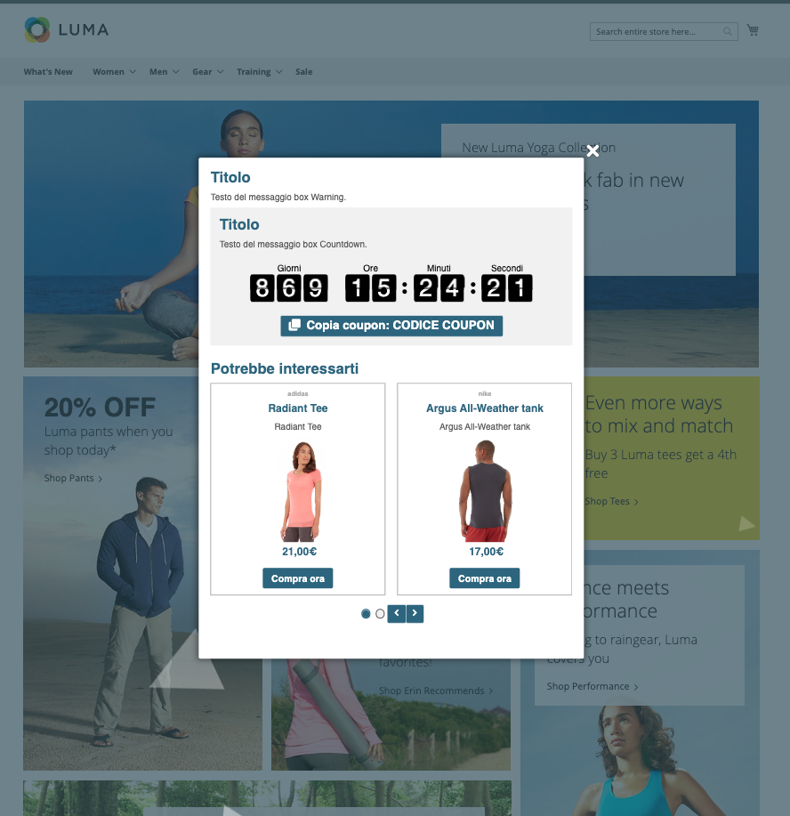 Template showing a pop-up warning in which you can insert a recommendation carousel, form, countdown and a button to copy the coupon code