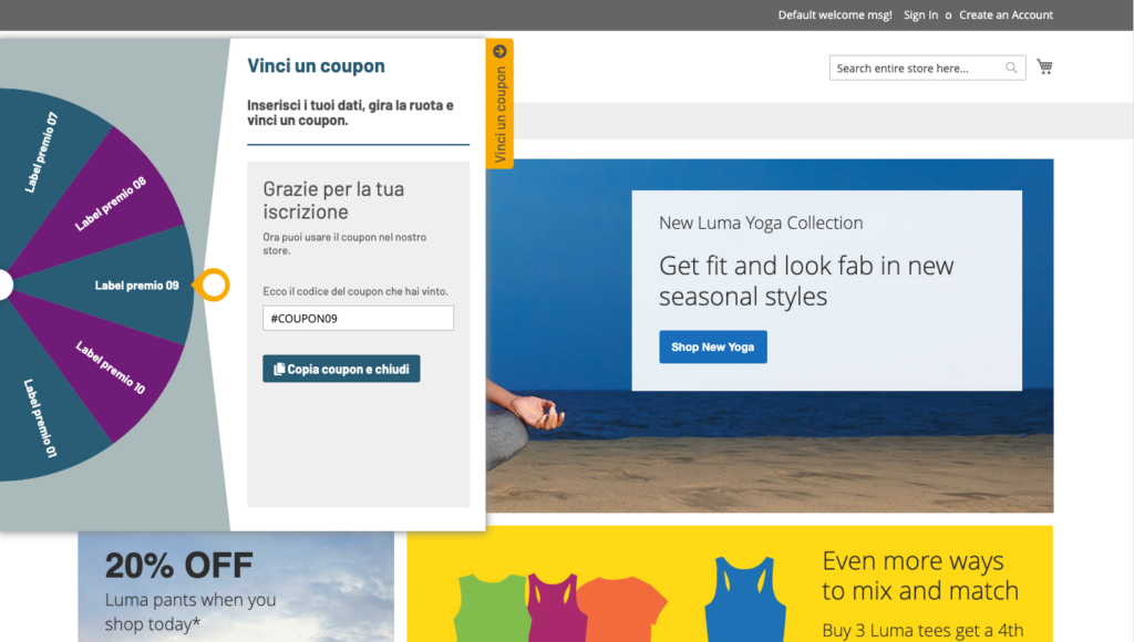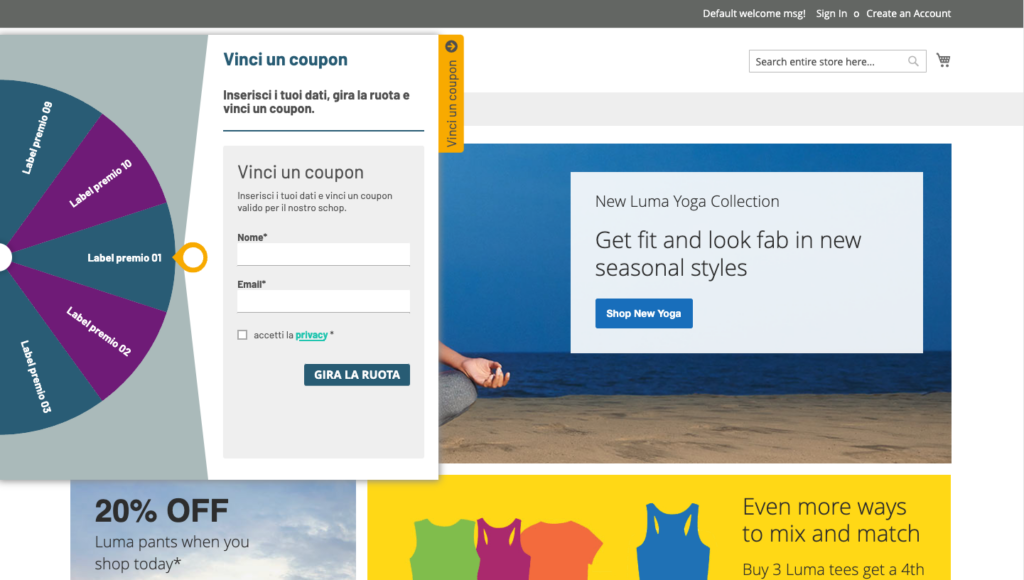 Template showing a behavioural message with a form and wheel that distributes coupon prizes randomly